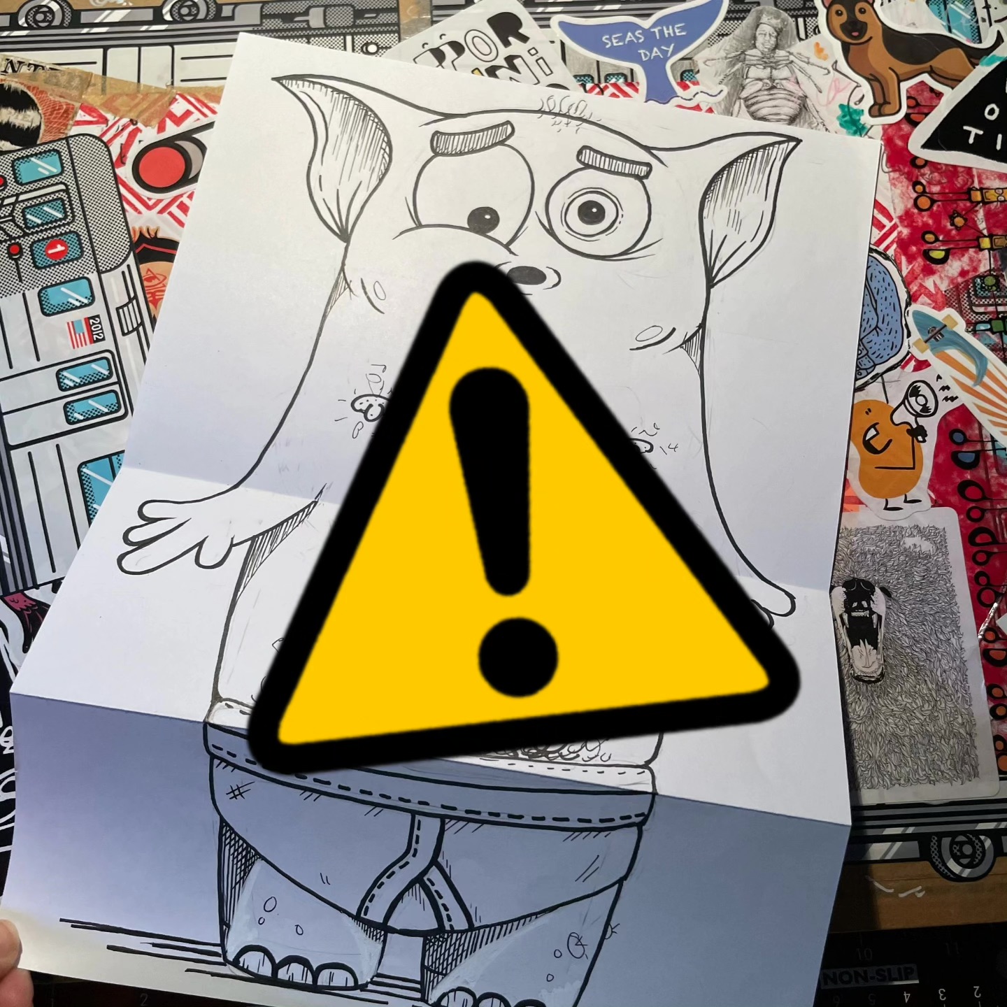 Below are the censored versions of the latest three drawings created with nothing more than black pens, late-night laughs, and zero regard for “good taste.”