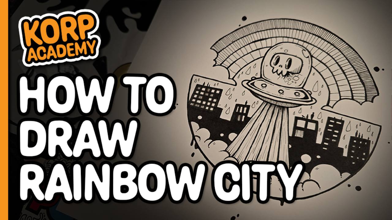 You'll need a compass to draw this one. Its a whole cityscape, rainbow and UFO crammed into a circle. We also touch on how to draw the chrome effect.