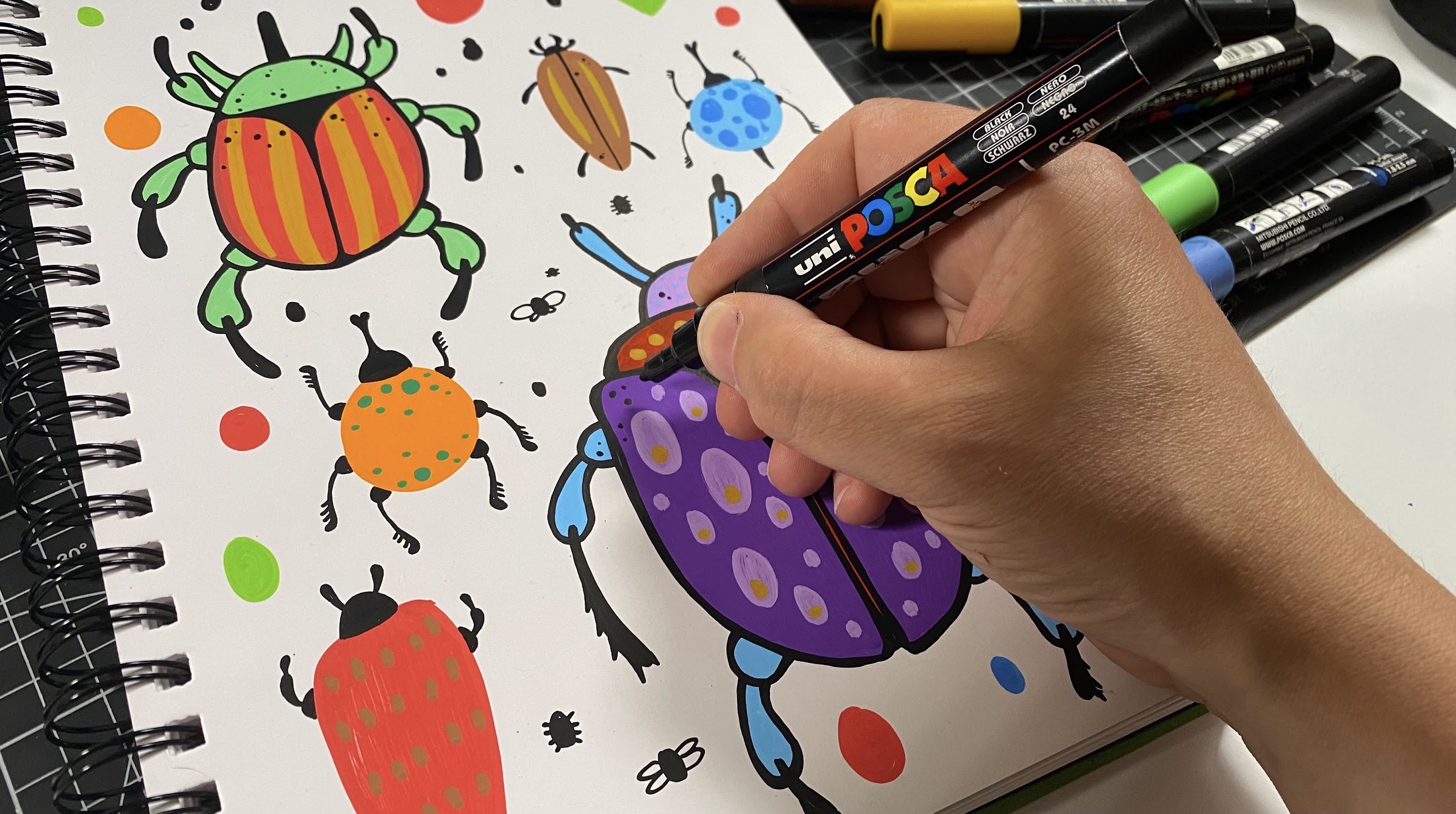 In this session we fill an entire page with colourful beetles and insects using a really simple process. We start by blocking in the basic shapes, layer colours for the shells and wings, then bring everything together with bold black outlines, patterns, and textures.
