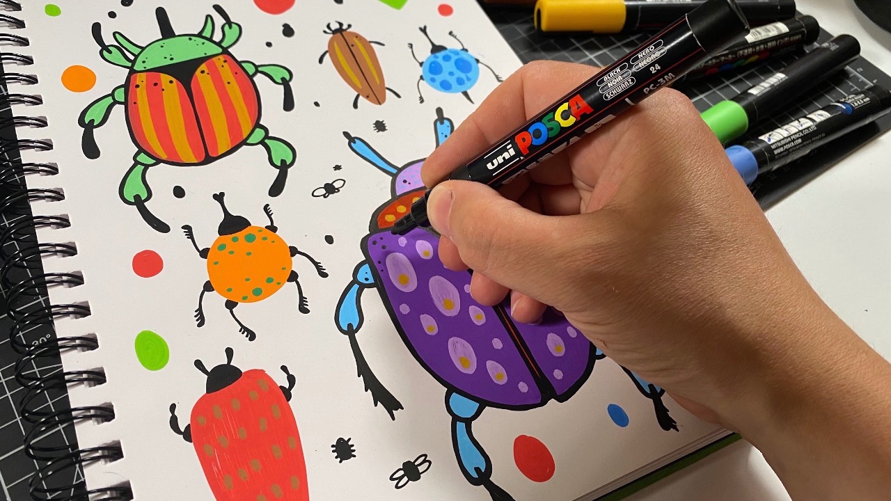 In this session we fill an entire page with colourful beetles and insects using a really simple process. We start by blocking in the basic shapes, layer colours...