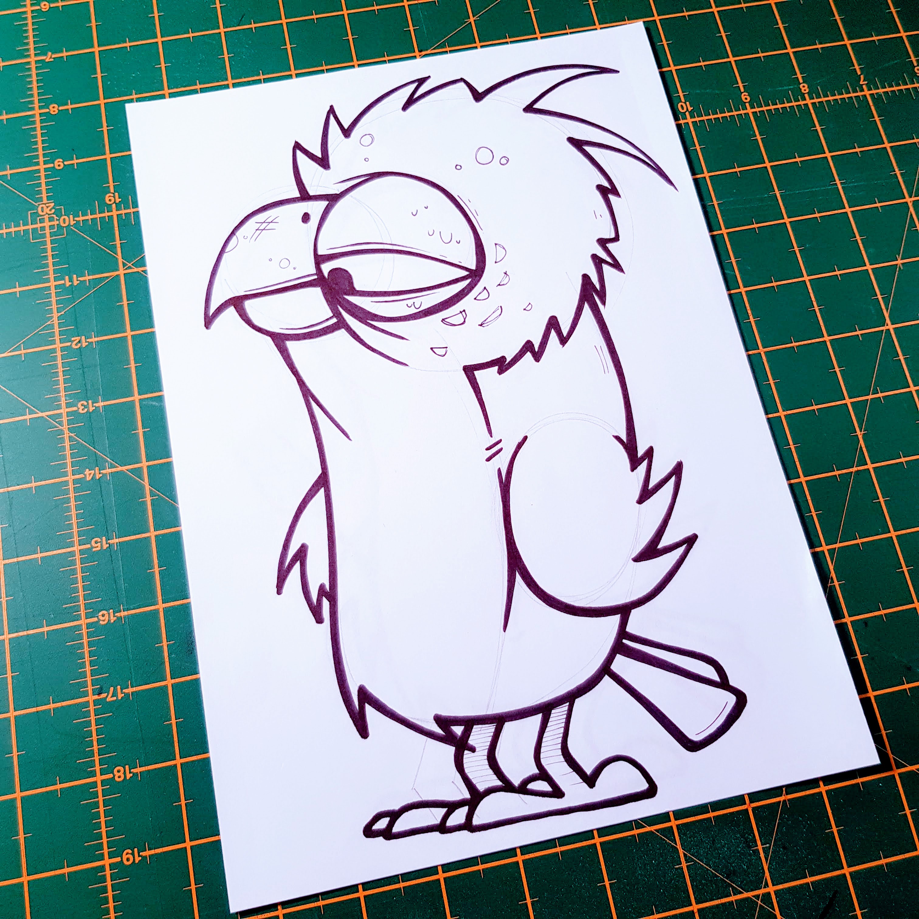 This is a scruffy little bird character with one heavy-lidded eye and a tired sort of look to it. It’s a good one to try if you want something simple that still gives you room to mess around with the beak, feathers and whatever the bird ends up holding.