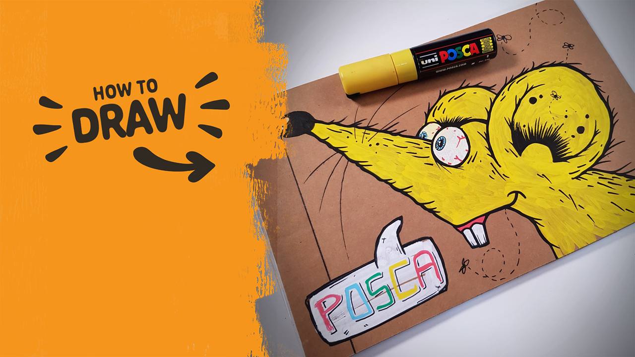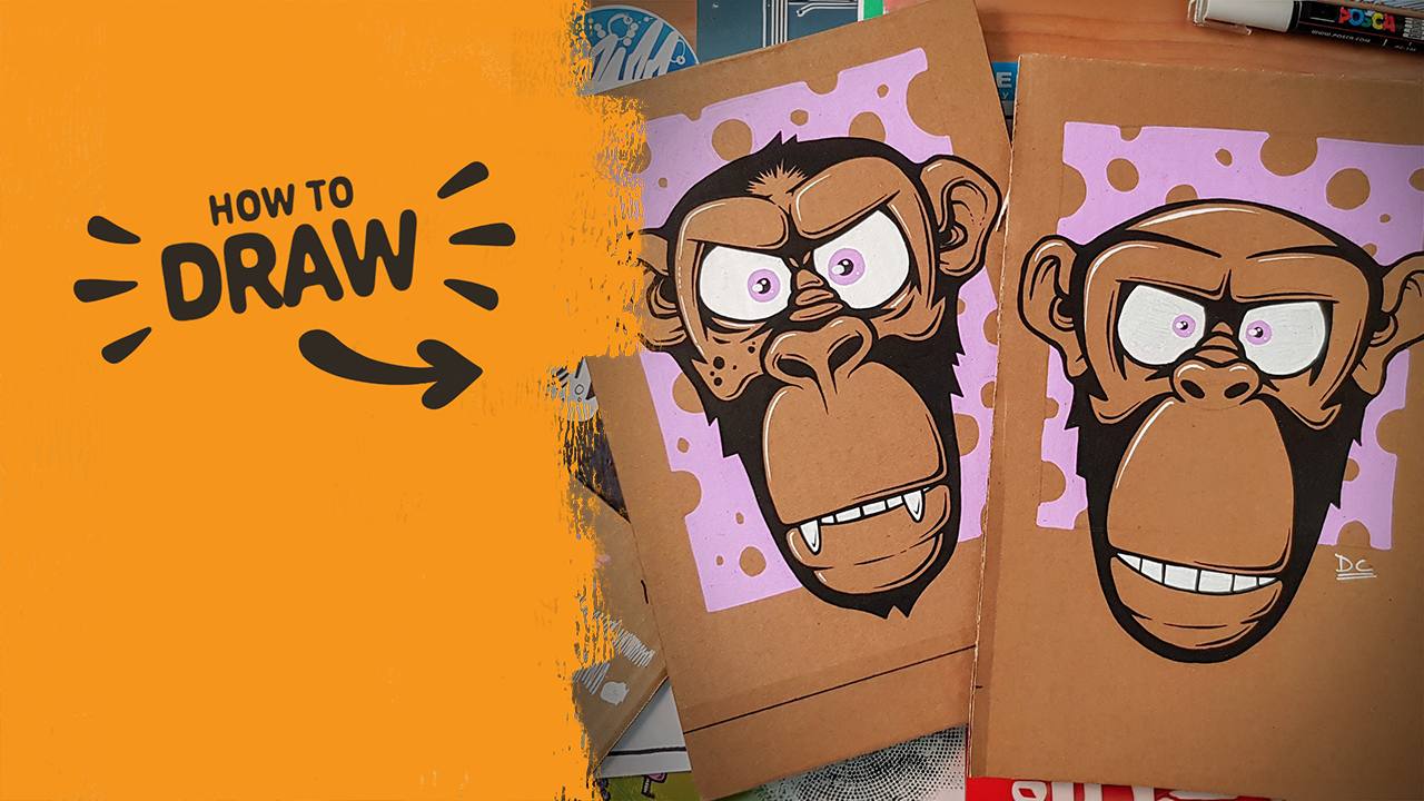 In this tutorial, you’ll draw a stylised angry monkey face using Posca pens on cardboard. It’s a good one to try if you want to build up a bold character using simple shapes, chunky black lines, and a limited colour palette.