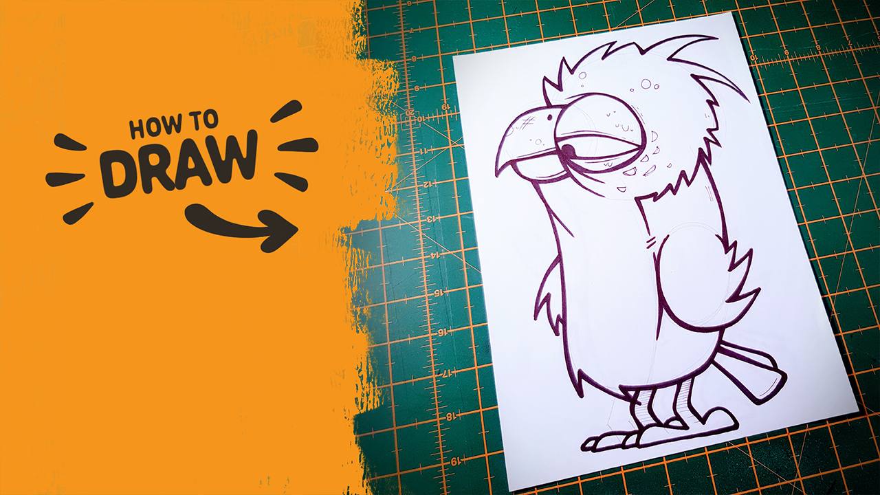 This is a scruffy little bird character with one heavy-lidded eye and a tired sort of look to it. It’s a good one to try if you want something simple that still gives you room to mess around with the beak, feathers and whatever the bird ends up holding.