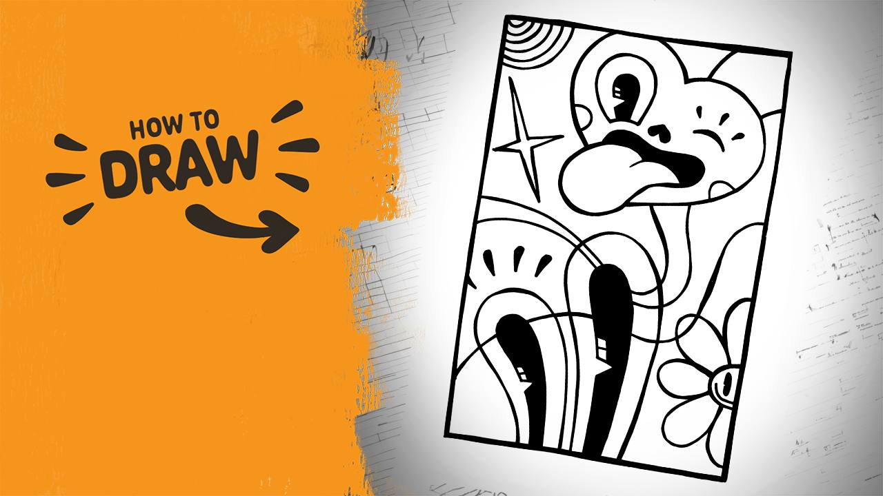 This one is based on the bold, playful style of Hattie Stewart.You’ll draw her big graphic eyes, a heart character, a daisy, and then tie the whole thing together with wavy lines.