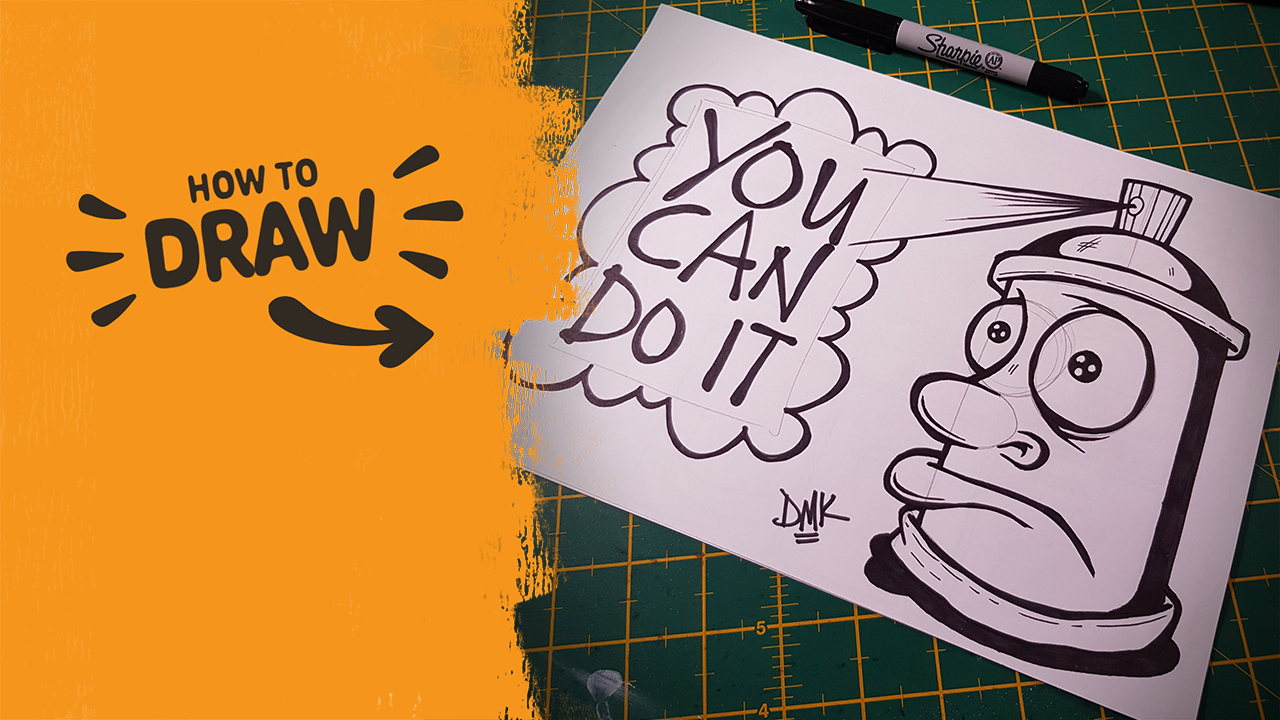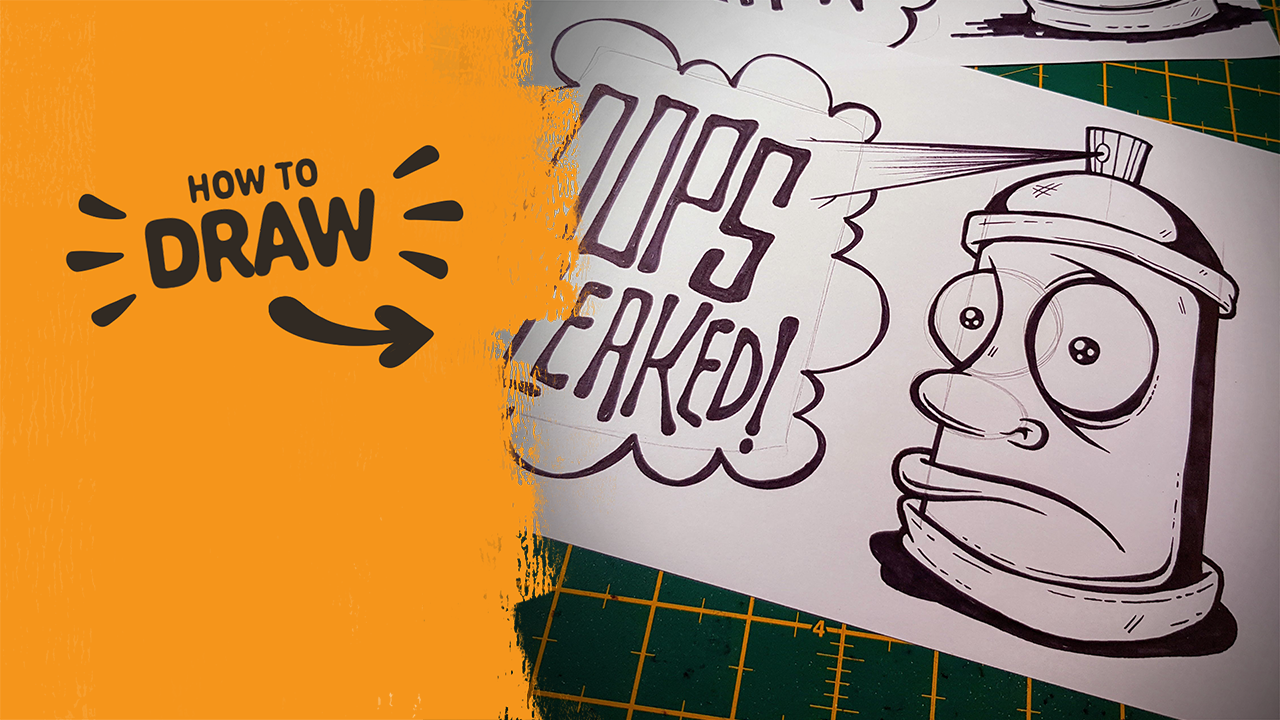 In this tutorial, we draw a simple spray can character with worried eyes, a fat lip, and a spray-painted speech bubble.